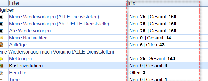 Wenn auf der Startseite die Spalte “Info“ eingeblendet ist, werden dort pro Filter Informationen wie “Neue“ oder “Gesamt“-Anzahl der Datensätze angezeigt.