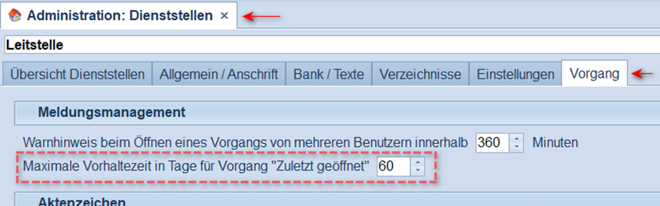 Trotzdem können in 180 Tagen einige Datensätze anfallen. Beispiel: pro Tag arbeiten 15 Anwender mit SIO und öffnen dabei 25 (neue) Meldungen. Es entstehen also über ca. 130 Tage (ohne Wochenende) x 15 Anwender x 25 Einträge = 48.750 Datensätze in der Liste für “Zuletzt geöffnet“. Grundsätzlich ist das für eine Datenbank kein Problem. Sollte es aber zu Performanceproblemen kommen, und alle Anwender sind sich einige, dass es genügt, z. B. nur 60 Tage von “Zuletzt geöffnet“ aufzubewahren, kann dies unter “Administration | Dienststellen“ im Reiter “Vorgang“ entsprechend konfiguriert werden.