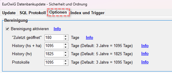 Öffnen Sie dazu das Datenbankupdate im manuellen Modus. Dort kann im Reiter “Optionen“ die Vorhaltezeit angepasst werden. Mit einem anschließenden Ausführen der Bereinigung, indem das Update gestartet wird, werden die eingestellten Werte auch für das nächste Mal vermerkt.