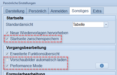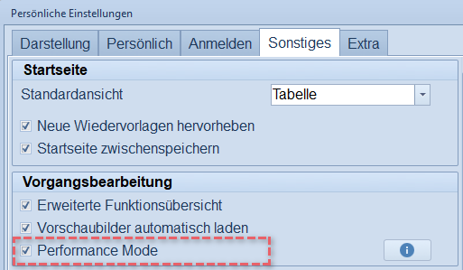 Der "Performance Mode" hat NUR Auswirkung auf das Ladeverhalten von Stammdaten in der Vorgangsbearbeitung! Auch mit aktiviertem "Performance Mode" werden alle "Stammdaten" unter dem gleichnamigen Hauptmenüpunkt beim Öffnen neu geladen.