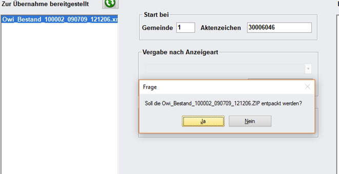 Die Datei „Uebernahme_xml_TTMMYYYY.laufendeNr.xml” und die zugehörige .zip-Datei mit den Bildern muss in den Übernahmepfad gelegt oder neu ausgewertet werden.