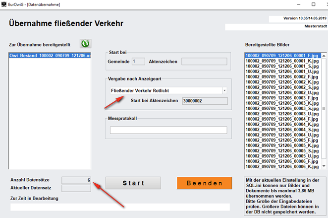 Im rechten Fenster werden die Bilder (.jpg) aufgelistet. Die Anzahl der zu übernehmenden Datensätze wird ermittelt.