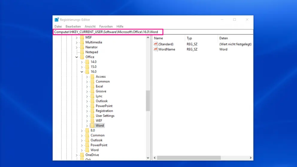 Navigieren Sie im linken Bereich der Registry zum Schlüssel "HKEY_CURRENT_USER\SOFTWARE\Microsoft\Office". Jetzt ist es wichtig zu wissen, welche Word-Version Sie haben. Wie Sie das herausfinden, erklären wir Ihnen in diesem Artikel. Wenn Sie Word 2016 nutzen, navigieren Sie weiter zu "\16.0\Word". Bei Word 2013 navigieren Sie zu "\15.0\Word" und die Einstellungen für Word 2010 finden Sie im Schlüssel "\14.0\Word".