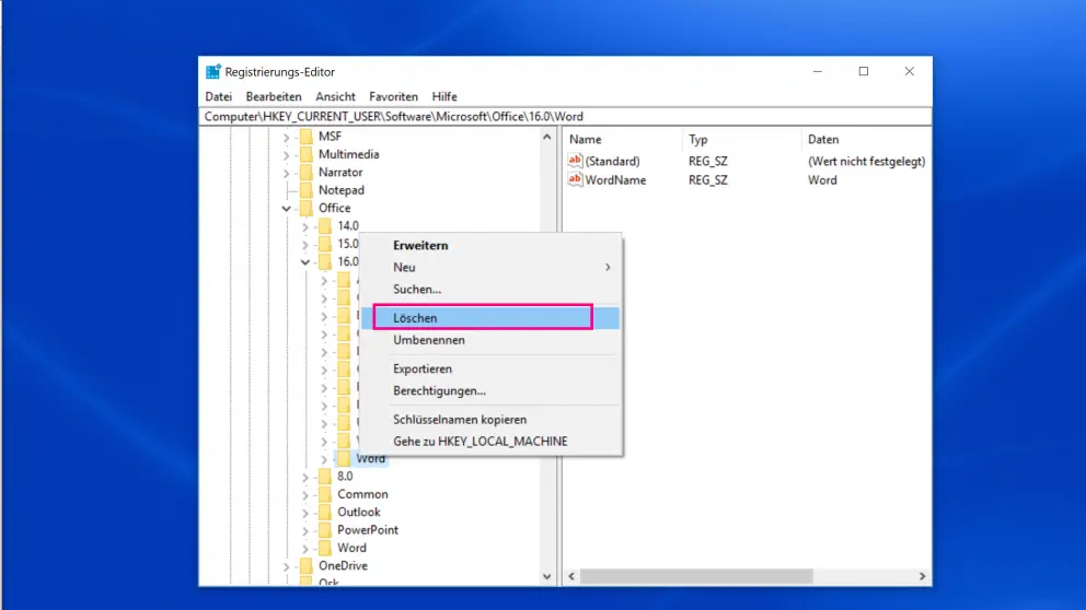 Machen Sie einen Rechtsklick auf den Word-Schlüssel und gehen dann auf "Löschen".