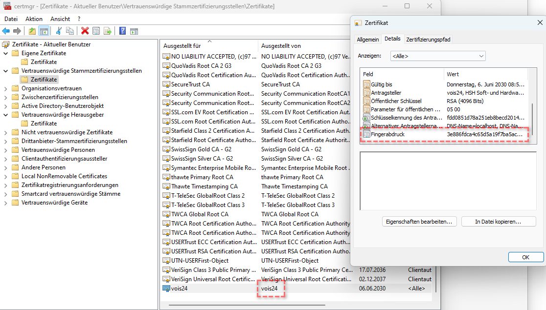 Die Angaben für die Felder “Zertifikat” und “Fingerabdruck” entnehmen Sie bitte Ihrem Zertifikat in der Windows-Zertifikatverwaltung: