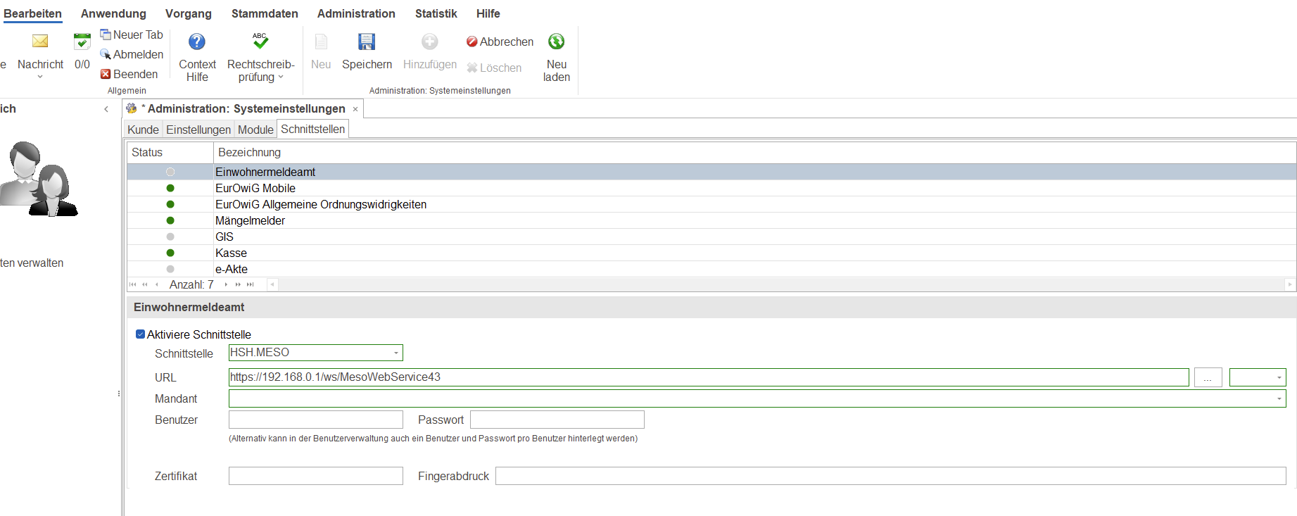 Um Einrichtung vornehmen zu können, navigieren Sie über “Administration” → “Systemeinstellungen” zum Reiter “Schnittstellen”. Wenn in der Liste der Punkt “Einwohnermeldeamt” ausgewählt wird, kann unterhalb der Liste die Schnittstelle aktiviert werden und die Einstellungen vorgenommen werden.