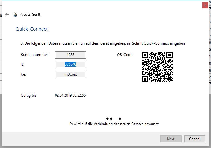 8 | Klicken Sie dann unten auf mit QuickConnect verbinden. Nach erfolgreichem Connect sehen Sie folgendes Bild am Gerät: ![]() |