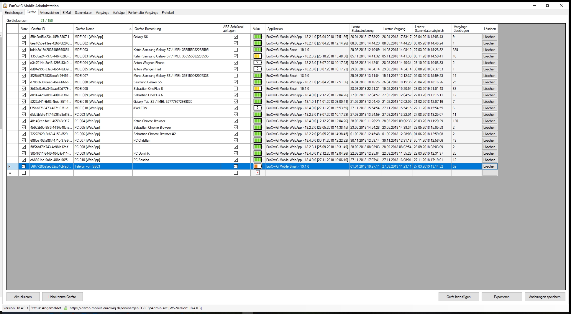 5 | Bitte überprüfen Sie hier in der Spalte "Applikation" die Versionsnummer von EurOwiG Mobile Smart. In diesem Fall: 19.1.0 Grundsätzlich empfehlen wir, dass bei allen Geräten die selbe und die neueste Version installiert ist, andernfalls kann es zu Problemen kommen. |
